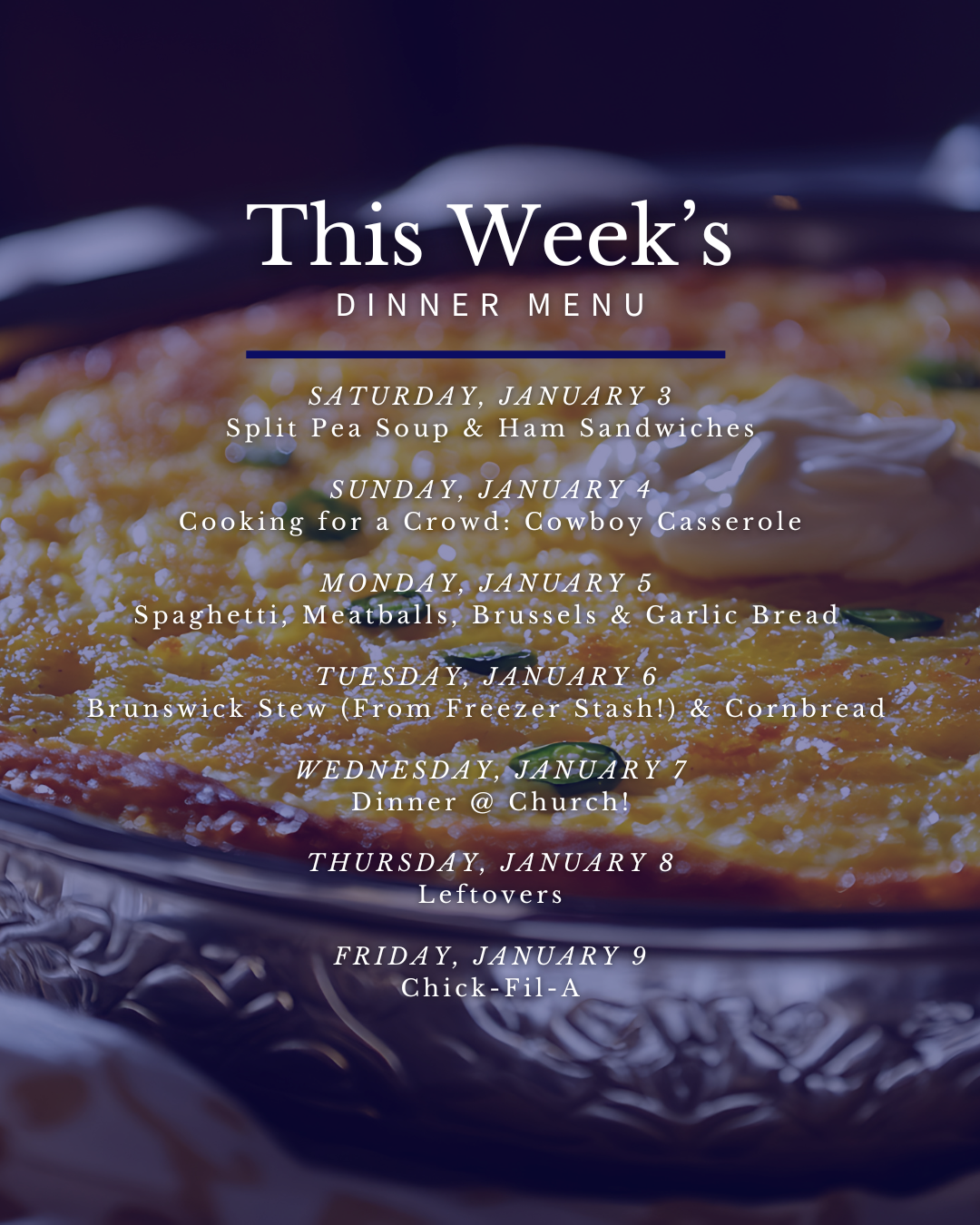 I’m batch cooking for our small group of about 12 people. My plan is for two cowboy casseroles: ground beef, pinto beans, corn, rotel, tater tots, shredded cheese, and cornbread. Plus a side of chips and salsa. Not the healthiest meal, but it’s filling and a crowd-pleaser!